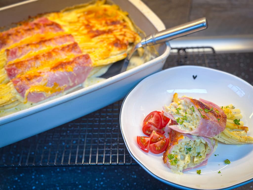 Wenn es schnell gehen soll, aber trotzdem richtig gut schmecken muss, sind diese Schinken-Makkaroni-Röllchen genau das Richtige. Die Kombination aus Kochschinken und einer cremigen Käse-Sahne-Soße wird in der Ofenhexe besonders zart und saftig – ein echtes Wohlfühlgericht für jeden Tag.
