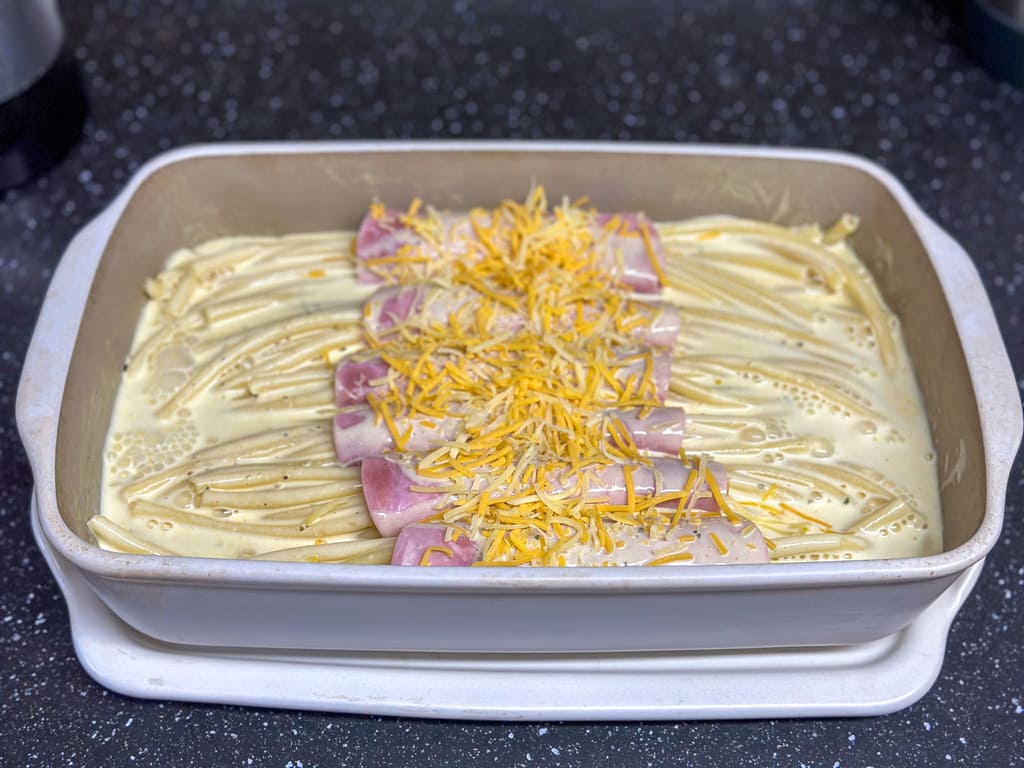 Der Kochschinken kann alternativ auch durch rohen Schinken ersetzt werden.